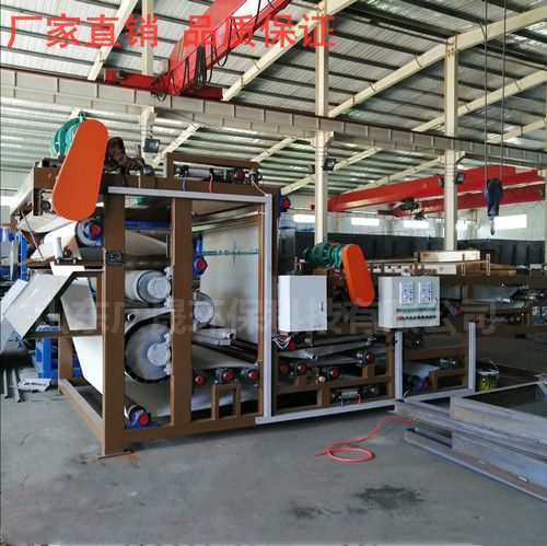 小型污泥脫水設備是通過兩條濾帶纏繞在一系列順序排列、大小不等的輥輪上,利用濾帶間的擠壓和剪切作用,來脫除料漿中水分的一種壓濾設備,具有著能連續作業、自動化程度高、節能、使用維護方便等優點,是一種進行污泥脫水減量化處理的理想設備。