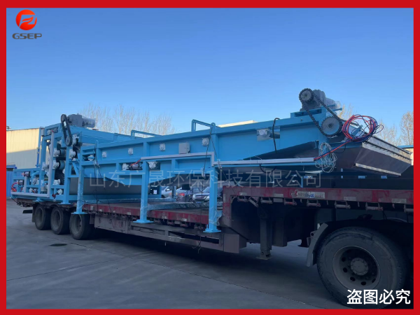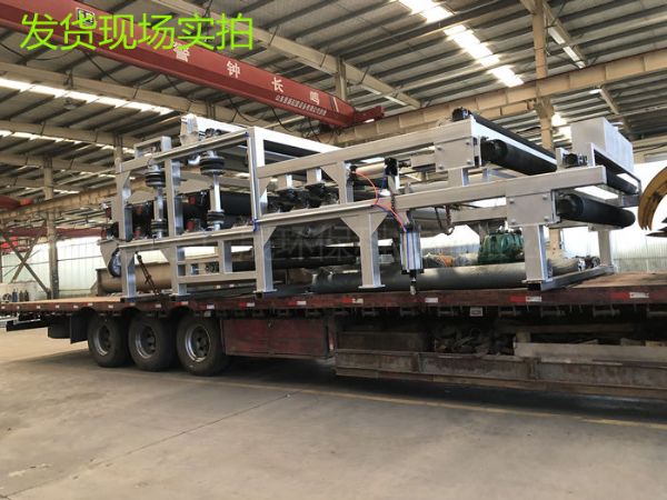 在重力的作用下自由水透過(guò)濾網(wǎng)背面而滲出分離,形成不流動(dòng)狀態(tài)的泥漿,達(dá)到壓榨脫水區(qū)實(shí)施較大壓力條件,然后隨著網(wǎng)帶的移動(dòng)而夾持在上下兩條網(wǎng)帶之間,經(jīng)過(guò)具有可調(diào)張緊力的過(guò)濾帶及直徑逐漸遞減的轉(zhuǎn)輥和對(duì)壓輥,實(shí)施連續(xù)增加的緩慢的對(duì)輥擠壓力、剪切力作用。