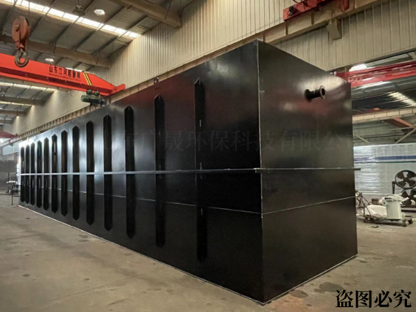 其一側設置有進水口,反應池內設置有浸沒式簾式膜組件,容納有活性污泥,周邊曝氣和膜片曝氣管路與風機聯通,膜組件上配套的集水管與抽吸泵聯通,待處理的污水通過進水口進入 MBR 生化反應池,污水在反應池內的 HRT 為 5h。經反應池內的活性污泥降解后,通過抗污染平板膜組件,然后由抽吸泵吸出進入清水消毒池。反應池內還設置有污泥提升泵,可以把多余的污泥提升到污泥硝化池內。反應池上部開有溢流口,可以使污水自流到箱外調節池。下部一側開放空口,便于池內結構維護、清理。