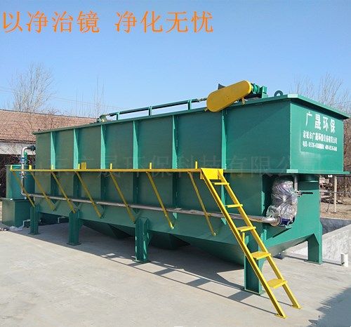 (2)氣浮機:經加藥反應后的污水進入氣浮的混合區,與釋放后的溶氣水混合接觸,使絮凝體粘附在細微氣泡上,然后進入氣浮區。絮凝體在氣浮力的作用下浮向水面形成浮渣,下 層的清水經集水器流至清水池后,一部分回流作溶氣使用,剩余清水通過溢流口流出。氣浮池水面上的浮渣積聚到一定厚度以后,由刮沫機刮入氣浮機污泥池后排出,氣浮底部的淤泥定時間用抽糞車吸出外運,或者是打開排污閥自流入污泥收集池,用污泥脫水機脫水處理,從而減少二次污染,安全可靠。