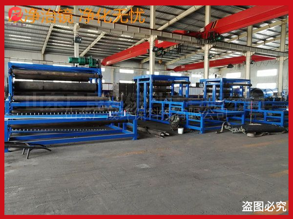 2.頭一個壓力段為楔形脫水區(qū),它是由兩條濾帶匯聚而成。經(jīng)過重力脫水后的污泥,通過濾帶的運動,進入楔形區(qū),在兩條濾帶形成的楔形空間由大變小,后兩條濾帶合攏的過程中,使夾在兩條濾帶之間的污泥受到的擠壓力緩緩的由小變大,將濾液從濾餅中壓出。