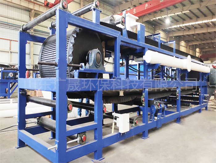 石化真空過濾機(jī)以濾布為過濾介質(zhì),采用整體的環(huán)形橡膠帶作為真空室。環(huán)形橡膠帶由傳動裝置傳動連續(xù)運(yùn)行,濾布鋪敷在膠帶上與之同步運(yùn)行,腔帶與真空滑臺接觸(真空室與橡膠帶間裝有環(huán)形摩擦帶并通入水形成水密封),料漿由布料器均勻地分布在濾布上。當(dāng)真空室接通真空系統(tǒng)時,在橡膠帶上形成真空抽濾區(qū),濾液穿過濾布經(jīng)橡膠帶上的橫溝槽匯總并由中心孔進(jìn)八真空室,固體顆料被截留在濾布上形成濾餅,隨著橡膠帶的移動,已形成的濾餅受壓力差影響逐步被脫干,后濾布與膠帶分開,在卸料輥處將濾餅卸出,進(jìn)入真空室的液體經(jīng)氣水分離器排出。卸除濾餅后濾布經(jīng)清洗后獲得回用,再經(jīng)過一組支撐輥和糾偏裝置重新進(jìn)入過濾區(qū),開始進(jìn)入新一過濾周期。石化真空過濾機(jī)實(shí)現(xiàn)了真正意義上的連續(xù)運(yùn)行、連續(xù)過濾,物料從進(jìn)料、脫水、卸渣到濾布清洗,可以不間斷的連續(xù)進(jìn)行。