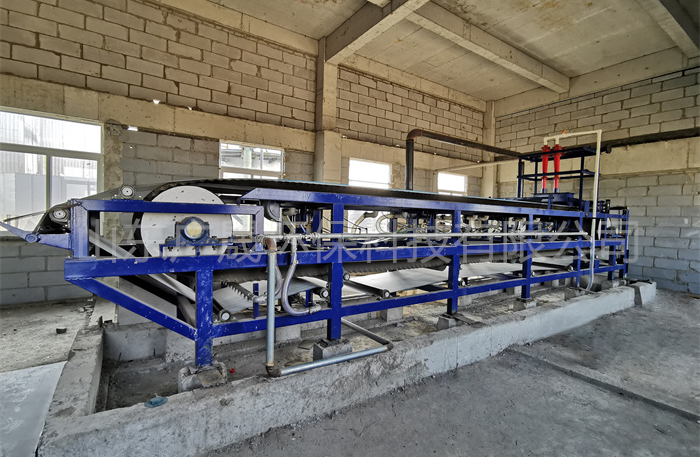 橡膠帶式真空過濾機以濾布為過濾介質,采用整體的環形橡膠帶作為真空室。環形橡膠帶由傳動裝置傳動連續運行,濾布鋪敷在膠帶上與之同步運行,腔帶與真空滑臺接觸(真空室與橡膠帶間裝有環形摩擦帶并通入水形成水密封),料漿由布料器均勻地分布在濾布上。當真空室接通真空系統時,在橡膠帶上形成真空抽濾區,濾液穿過濾布經橡膠帶上的橫溝槽匯總并由中心孔進八真空室,固體顆料被截留在濾布上形成濾餅,隨著橡膠帶的移動,已形成的濾餅受壓力差影響逐步被脫干,后濾布與膠帶分開,在卸料輥處將濾餅卸出,進入真空室的液體經氣水分離器排出。卸除濾餅后濾布經清洗后獲得回用,再經過一組支撐輥和糾偏裝置重新進入過濾區,開始進入新一過濾周期。橡膠帶式真空過濾機實現了真正意義上的連續運行、連續過濾,物料從進料、脫水、卸渣到濾布清洗,可以不間斷的連續進行。